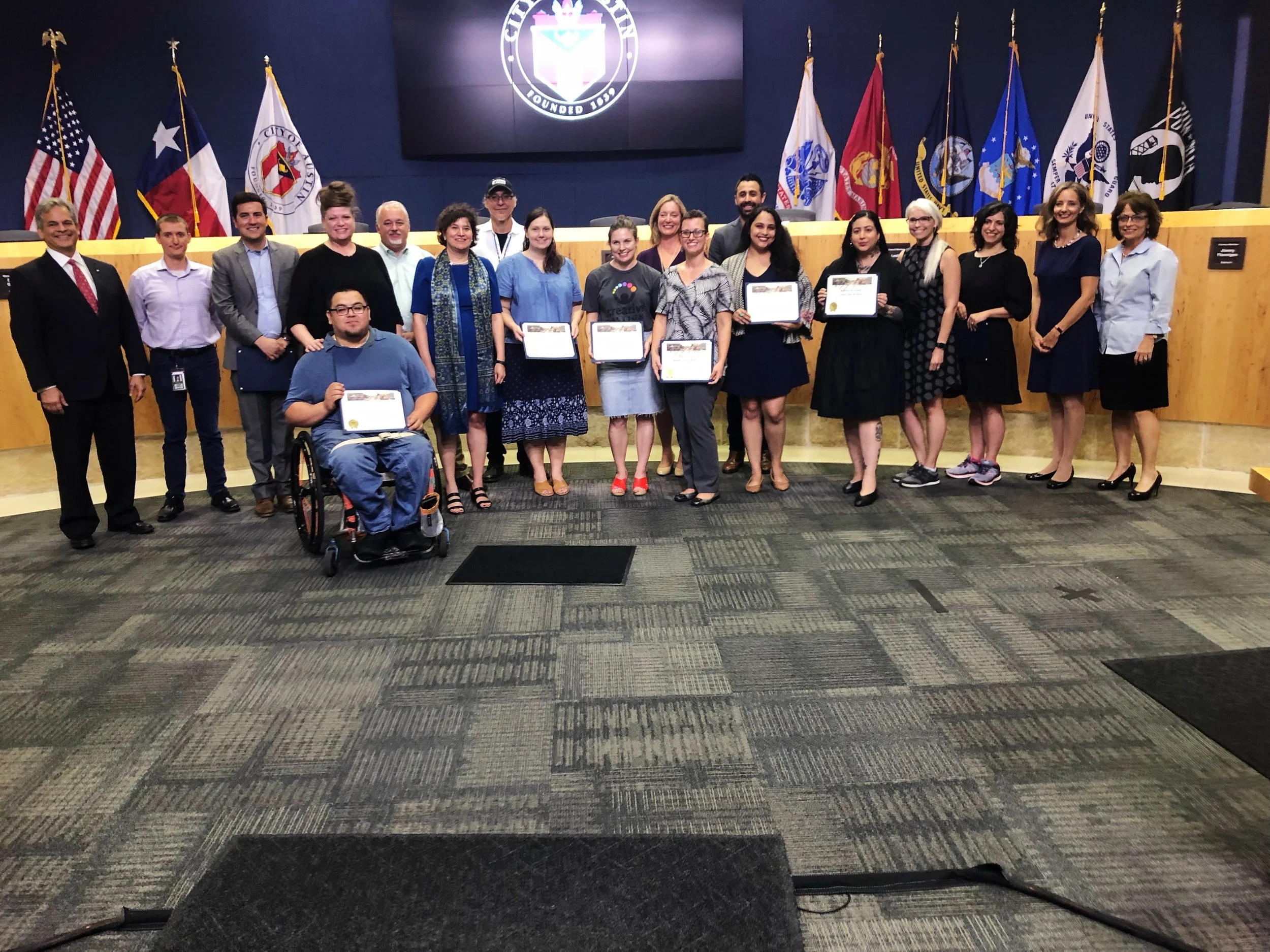 Motion Media Arts Center and 8 other fellow organization at City Hall with Mayor Adler.